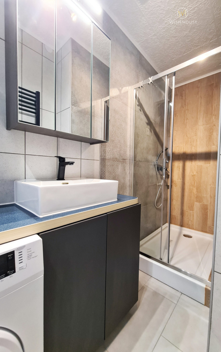 - łazienka z prysznicem, umywalką, WC i pralką.
