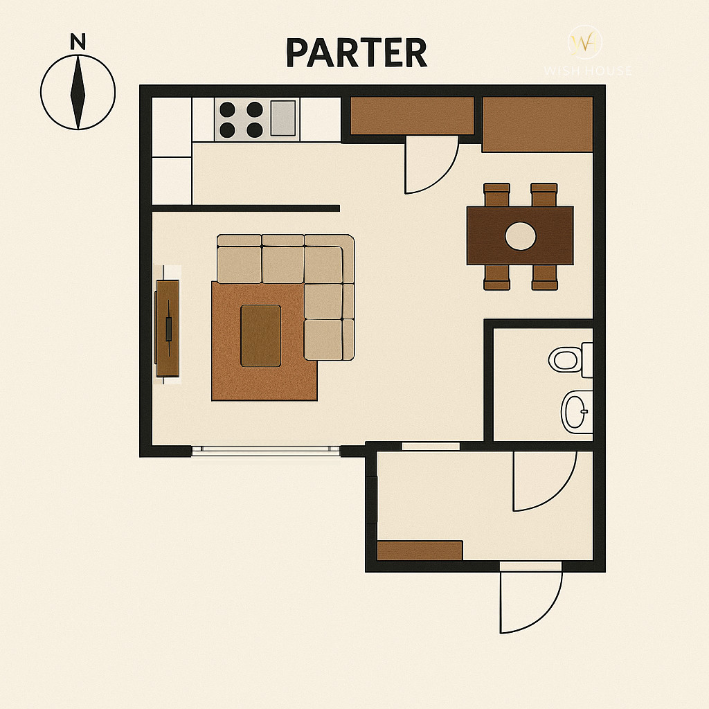 - przestronny salon, jadalnia, aneks kuchenny otwarty( w pełni wyposażony), toaleta, wiatrołap, pomieszczenie gospodarcze, taras